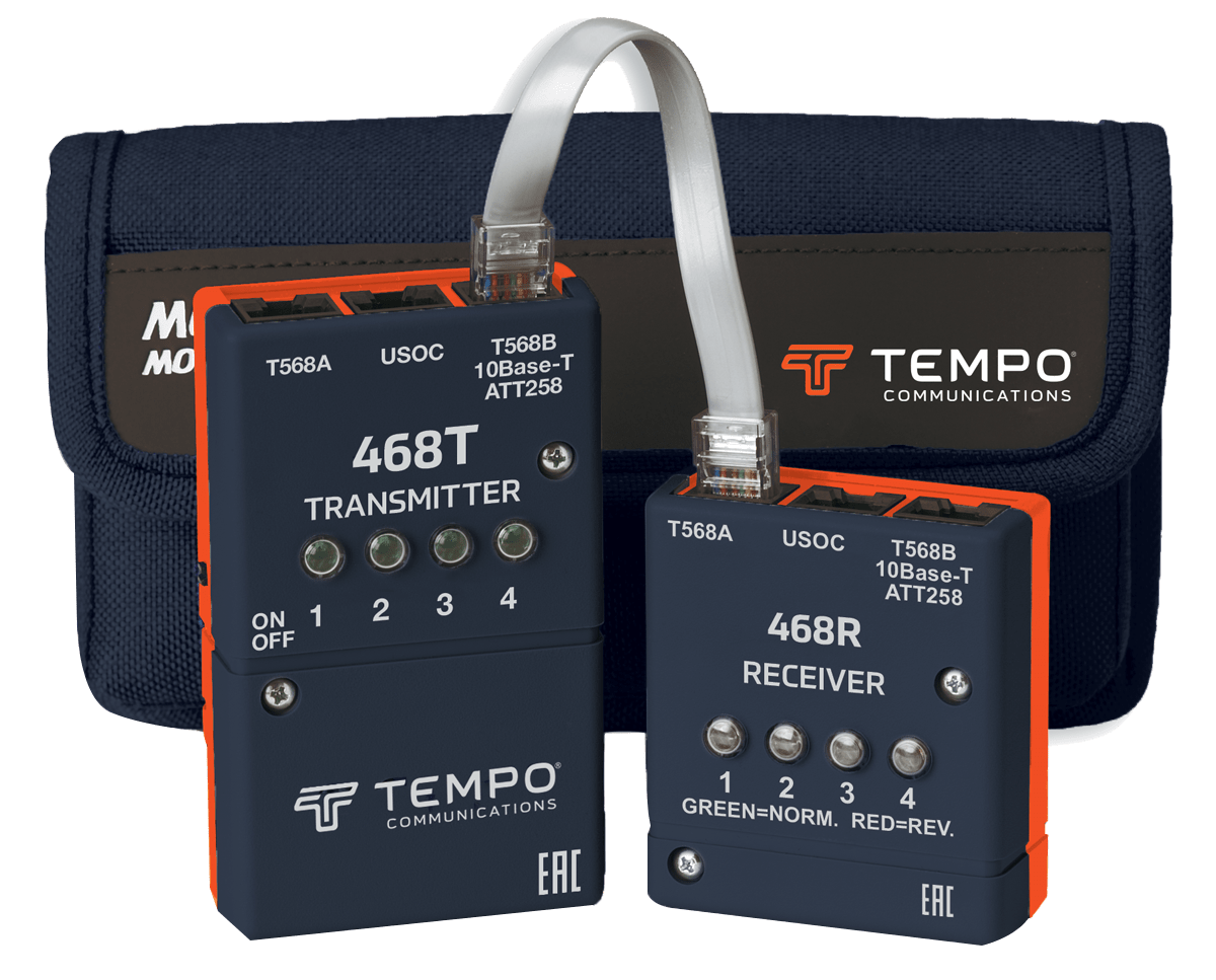 The Tempo Communications 468-G Modular Cable Tester and Wiremap Tester is used to test four-pair data and voice cable links terminated with standard, modular, eight-position RJ45 jacks. It features sequentially lighting LEDs corresponding to each wire for easier diagnosis of mis-wires than conventional, pair-checking testers. The built-in tone generator easily identifies cable at remote locations. Connecting the receiver unit automatically activates the test process. Sequencing red and green LEDs provide fast, accurate and easy-to-understand results. This handy tester identifies open and short circuits, reversed and transposed pairs with an alert if connected to an active circuit without harming the unit. Shielded ports test both shielded and unshielded cabling. It tests cables to T568A, T568B (AT&T 258A/10 Base T) and USOC wiring standards. The 468-G tester comes with two RJ-45 adapter cords, 468T transmitter and 468R receiver. One 9-V battery is required. This 8-ounce kit measures 7.125” x 3.75” x 2”. One-year warranty.